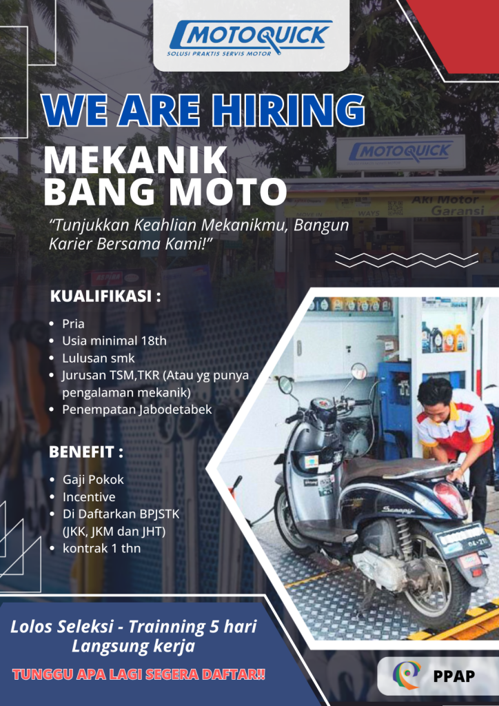 Kami membuka kesempatan bagi Anda yang memiliki keterampilan di bidang servis motor untuk bergabung bersama tim kami.